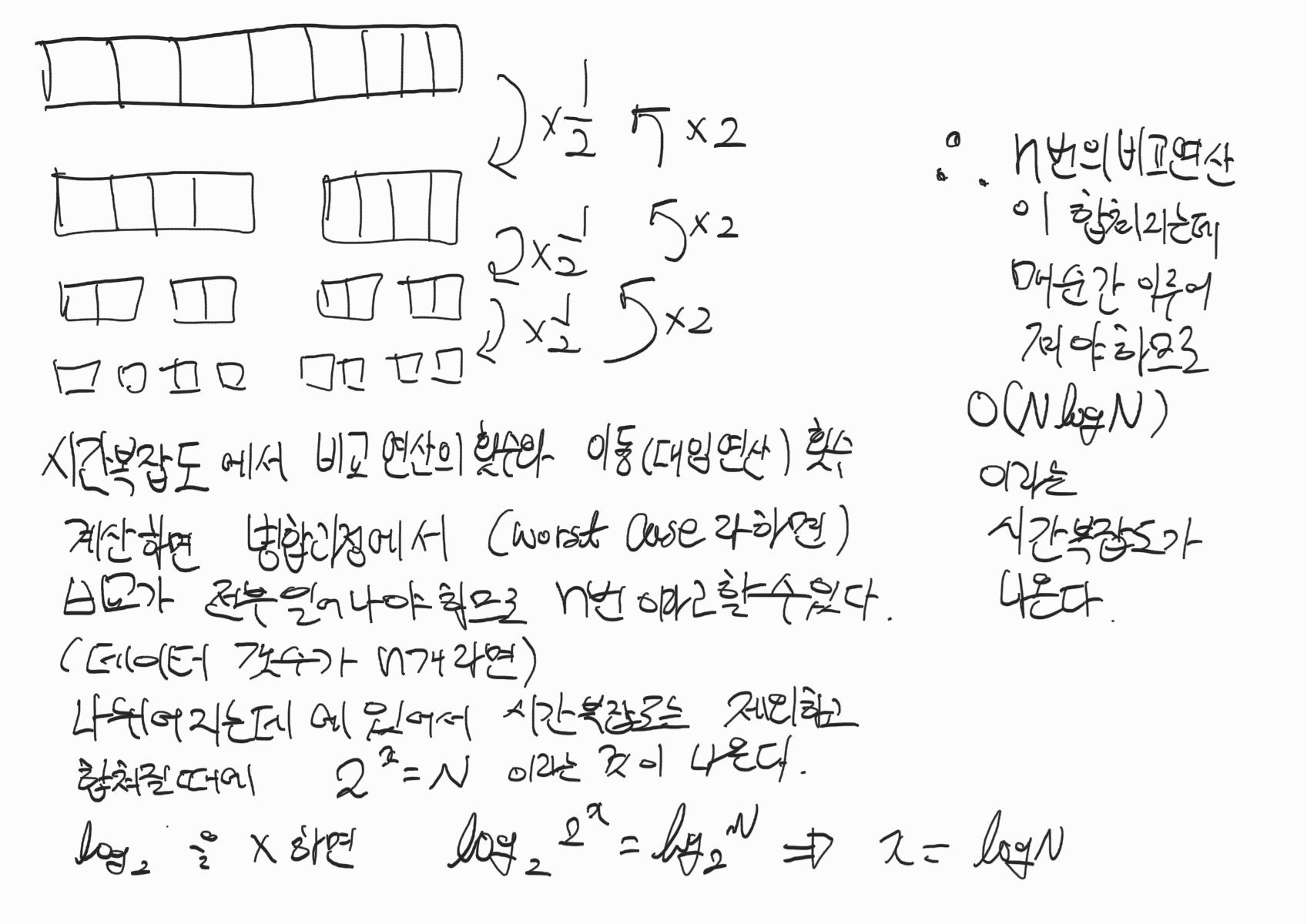 하지만 지금 배울 병합정렬은 편향되게 분할 될 가능성이 없다. 정확히 반 반씩 나누기 때문에 최악의 경우에도 O(N*logN)의 시간복잡도를 보장한다.