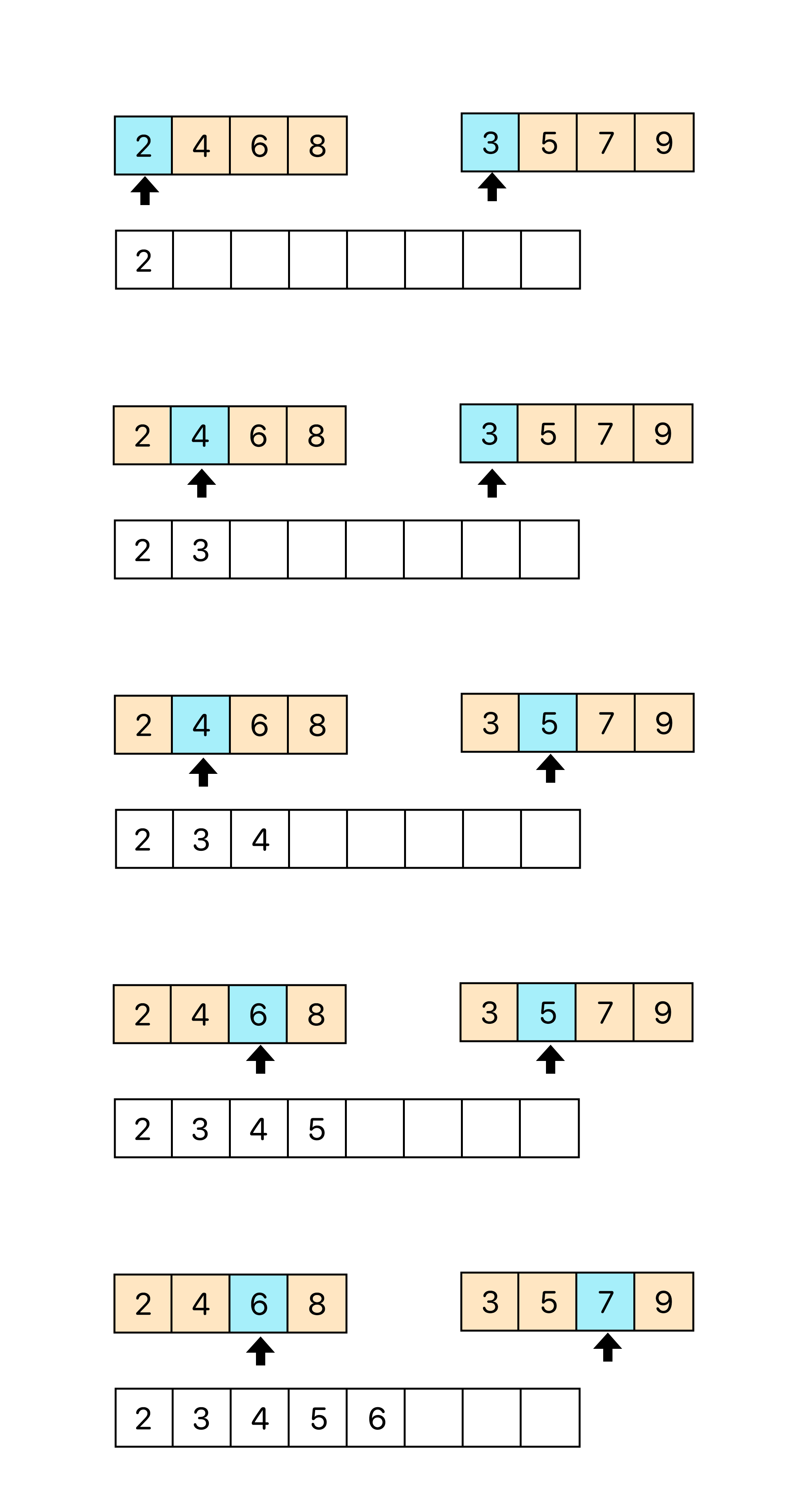 방법은 나뉘어진 배열 2개에 대해 합치게 되는데 이때 각각 배열의 첫번째 인덱스의 값들을 비교해서 작은 것부터 생성한 배열에 넣는것이다.