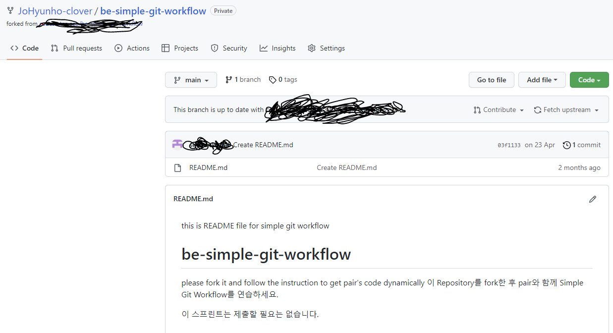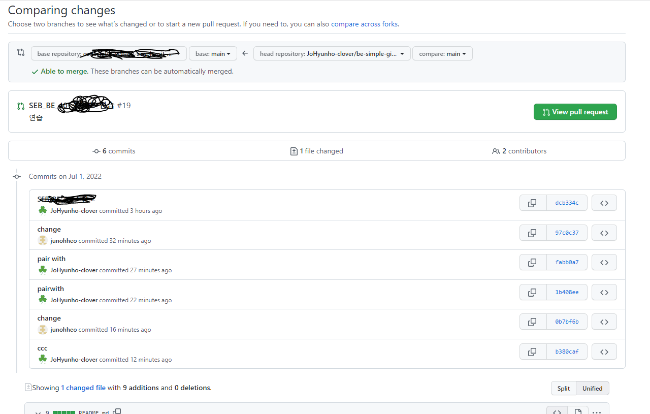 2. pair분이 나의 레포지토리를 Pull해서 가져가기전에 pair분인 자신의 README.md파일 수정해서 pair인 자신의 레포지토리에 push해서 올린다. (이때 뒤에 문자를 추가한다.)