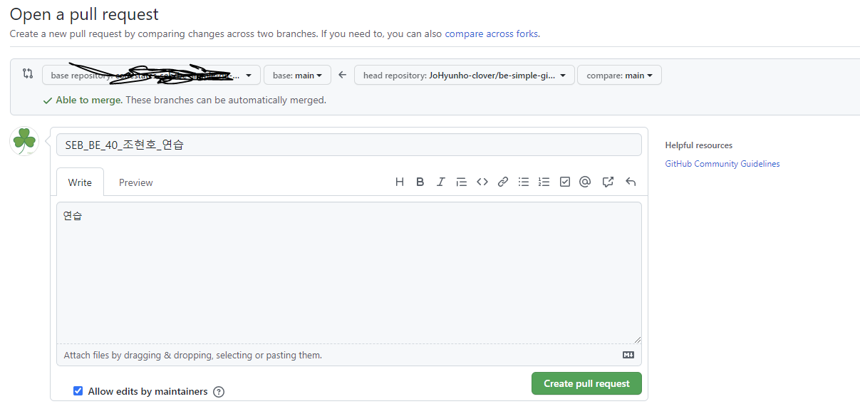 pr한후 다른사람의 github repository에 정상적으로 PR요청이 갔다.