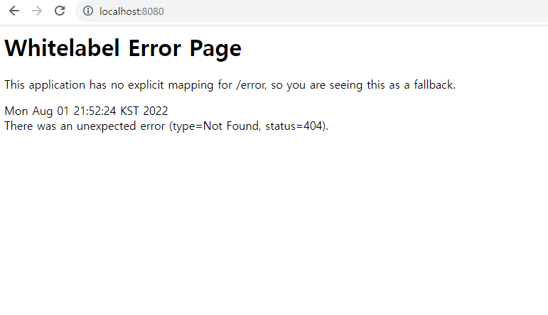 그리고 인텔리제이에서 main파일에 있는 걸 구동시킨 후 localhost:8080을 웹페이지 URI에 입력하면 밑과 같이 뜨면 성공이다.