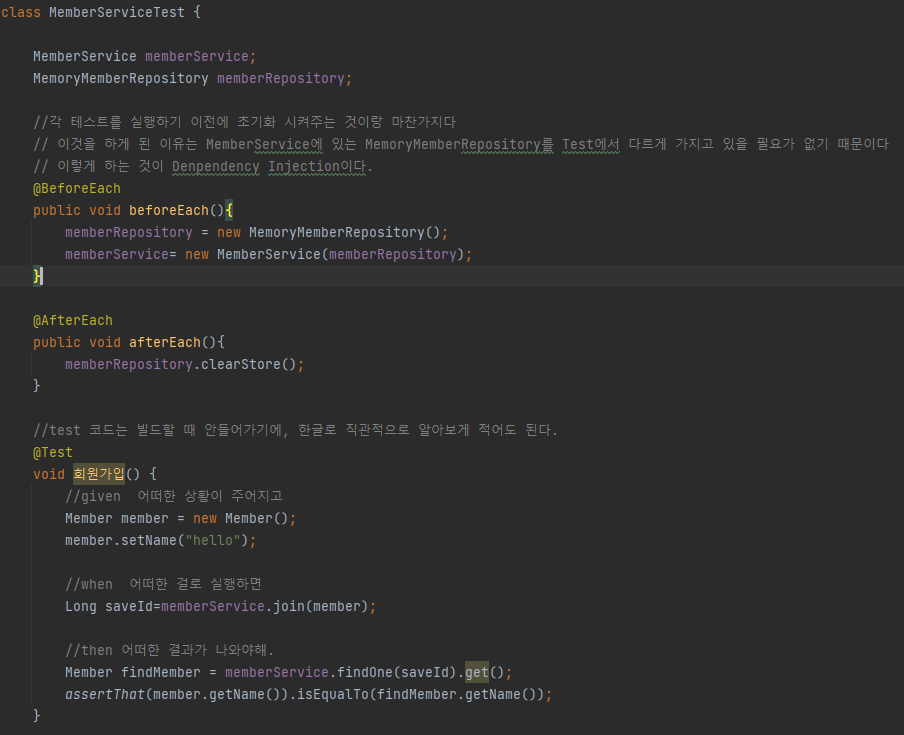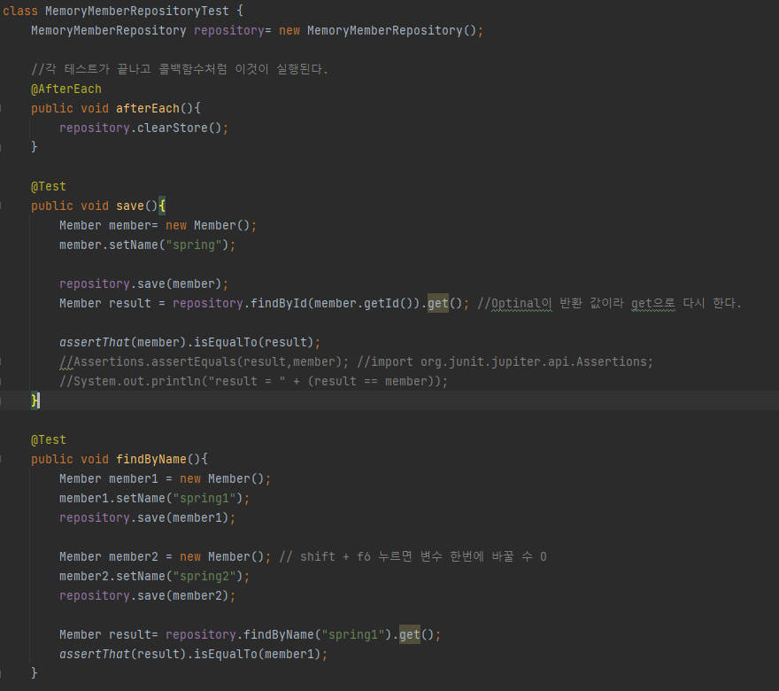 이때 중요한 점은 각 테스트들이 서로 순서상관없이 의존관계없이 설계되어야한다. 이렇게 하기 위해서는 공용 데이터들을 처음 값으로 초기화를 해주어야한다. -> 이것을 @AfterEach라는 어노테이션을 이용해서 한다.