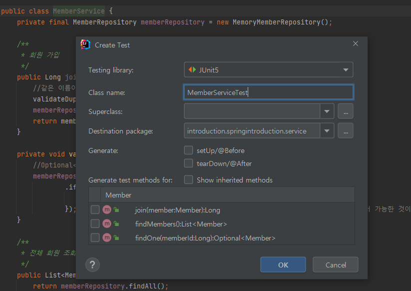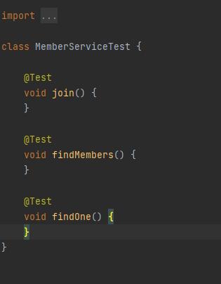 위에서 만든 서비스 클래스에서 ctrl + shift + T(Window 기준)를 입력하면 자동적으로 test를 기본 틀을 잡아준다 밑의 결과이다.