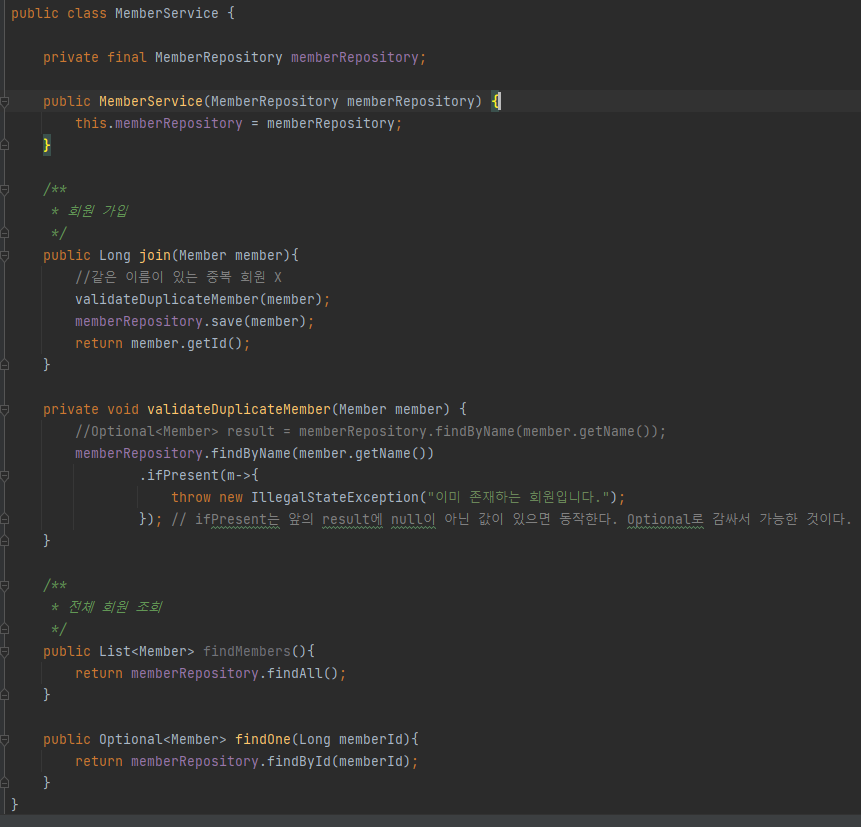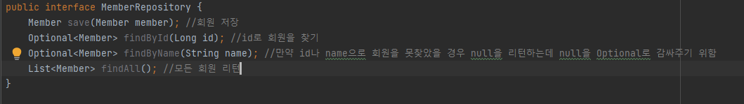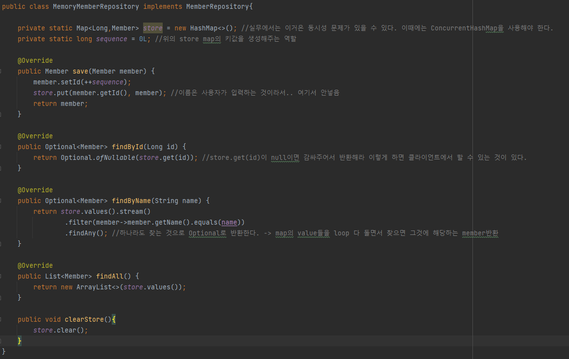 위의 리포지토리에서 MeberRepository를 인터페이스로 적은 이유는 지금은 데이터베이스를 사용하지 않고 메모리에 저장하여 하지만, 나중에 DB를 사용할 때 인터페이스를 이용해 구현한 클래스를 하나 만들어 그것을 쓰려고 하기 때문이다.
