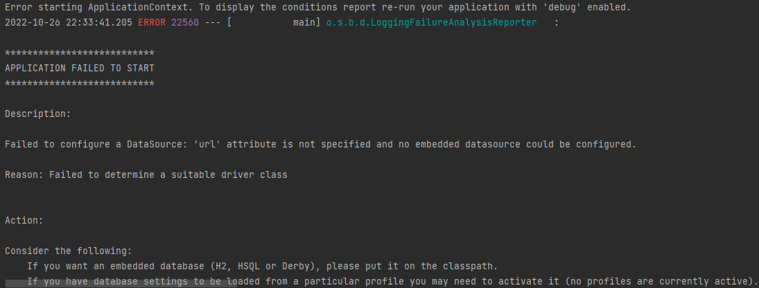 원인을 알아보니 mysql 드라이버를 추가시켜놓고 해당하는 datasource url을 넣어주지 않아서 발생하는 것이었다.