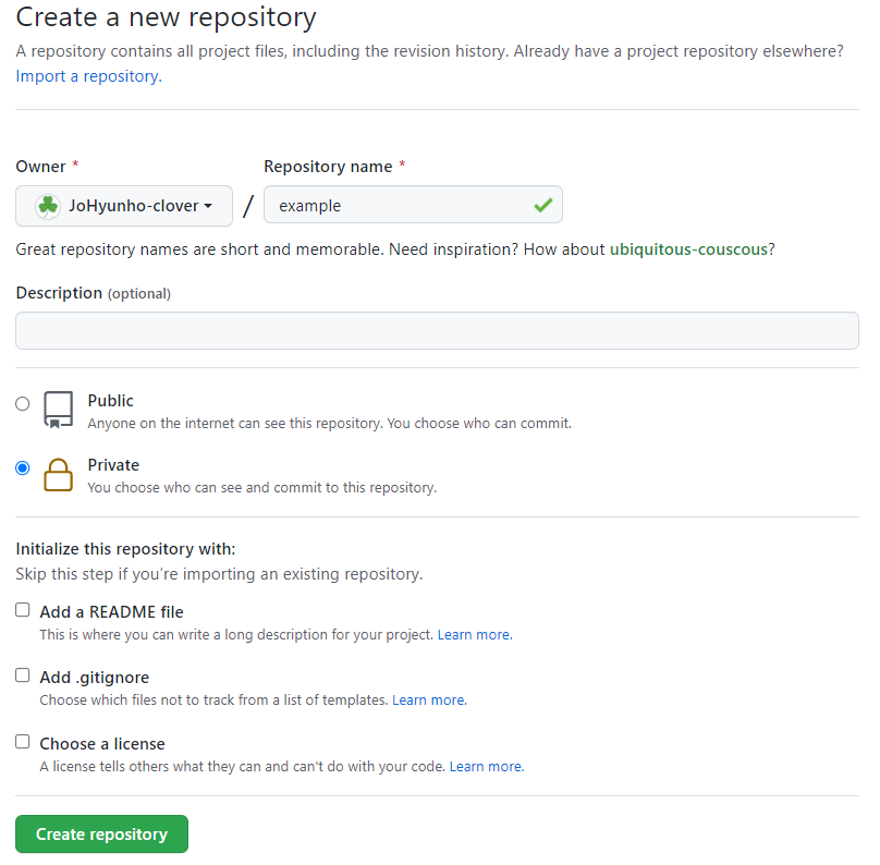 # repository의 주소는 본인의 github 주소 (HTTPS를 클릭한 후, 복사를 클릭해서 한다.)