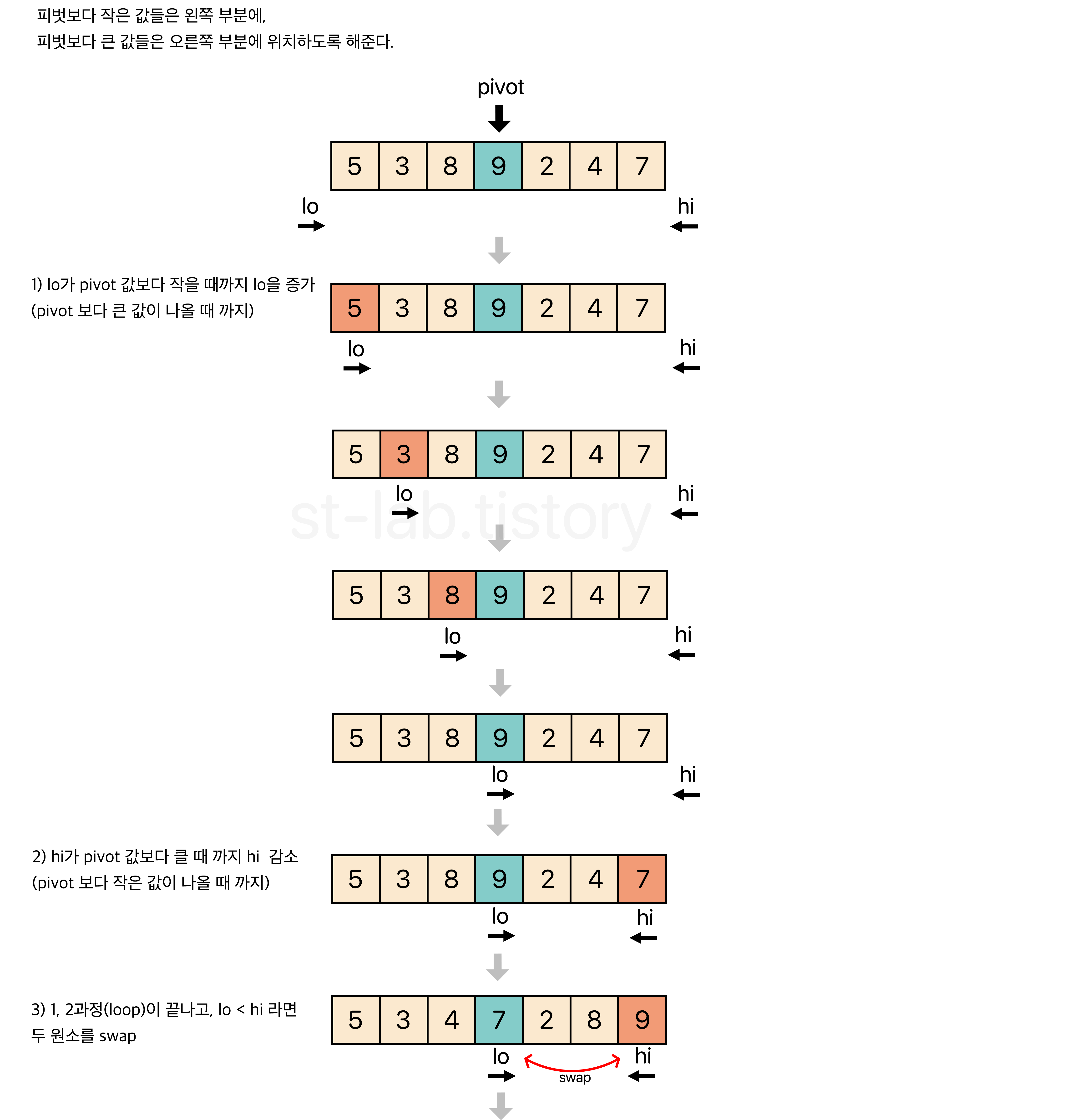 이에 해당하게 되는데 특징은 i가 우리가 지정한 피벗값을 지나 swap이 될 수 있다는 것이다.