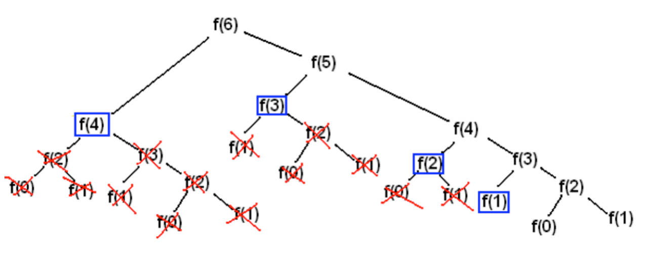 우선 동적계획법이 아닌 그냥 재귀함수로써 풀게 된다면 빨간색 X표시에 대한 연산이 다 이루어지기 때문에 시간복잡도가 동적계획법보다 증가하게 된다.
